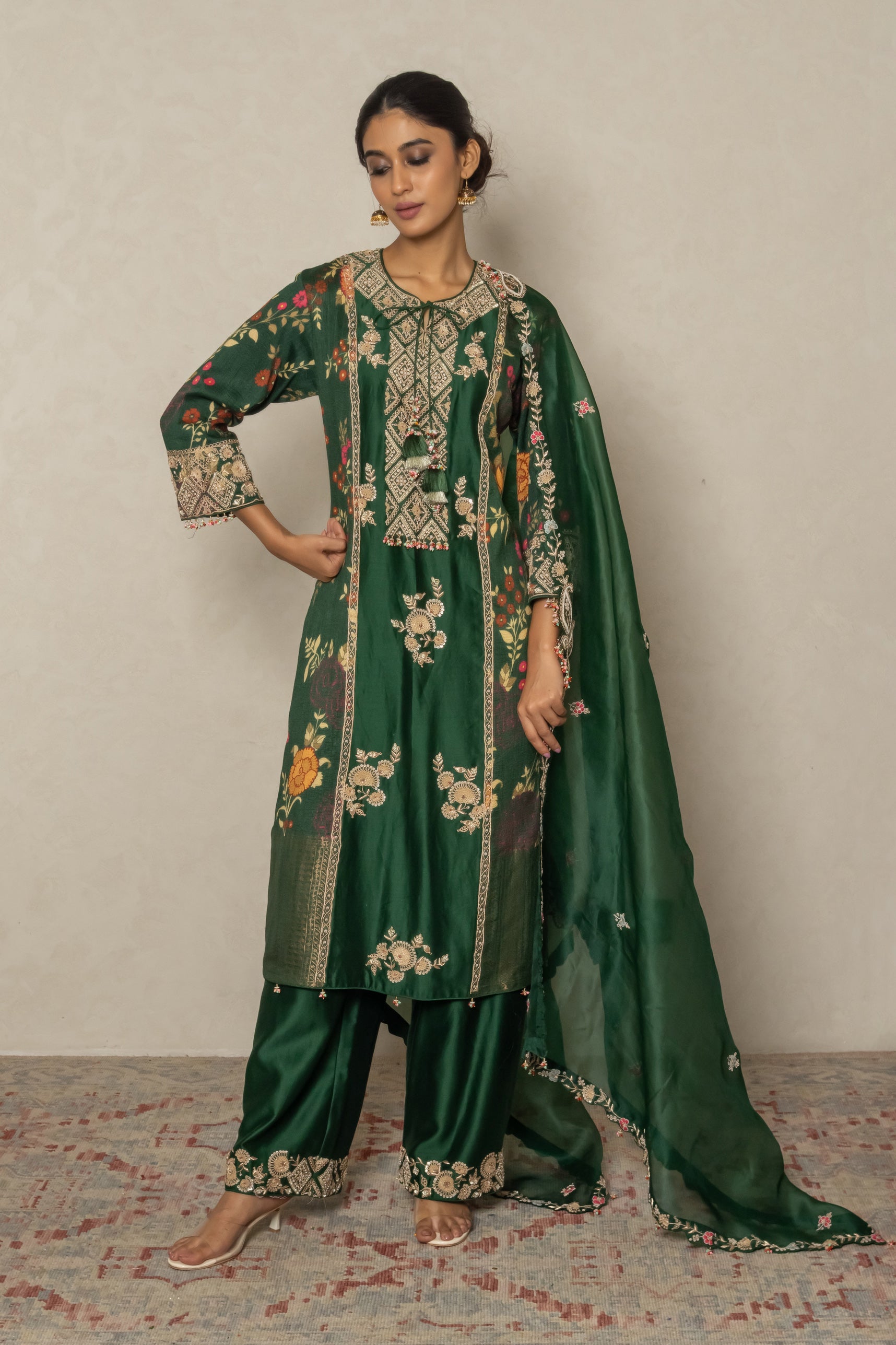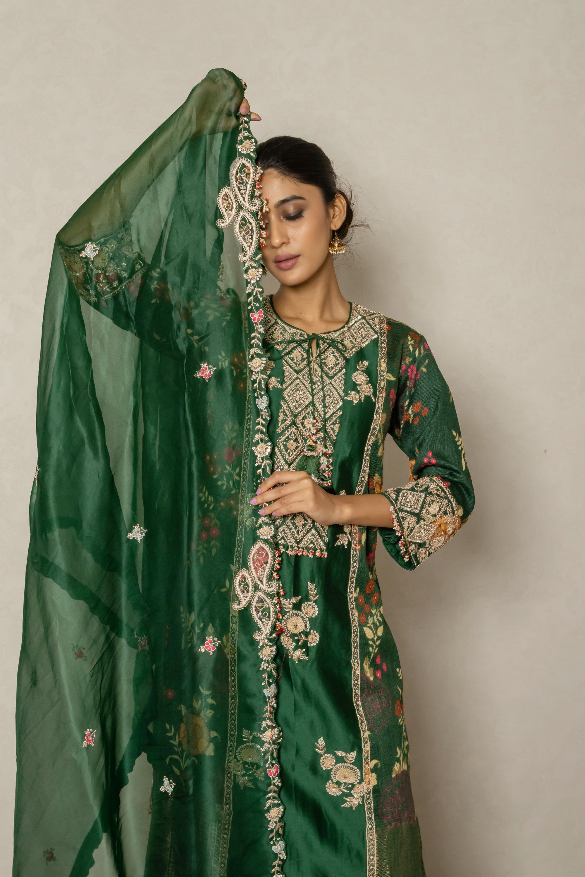 Elegant dark green silk kurta featuring silk with delicate floral print, enhanced with intricate Zardozi embroidery for a festive and regal appeal. Paired with a graceful organza dupatta adorned with matching handwork, this ensemble is perfect for weddings, celebrations, and special occasions.